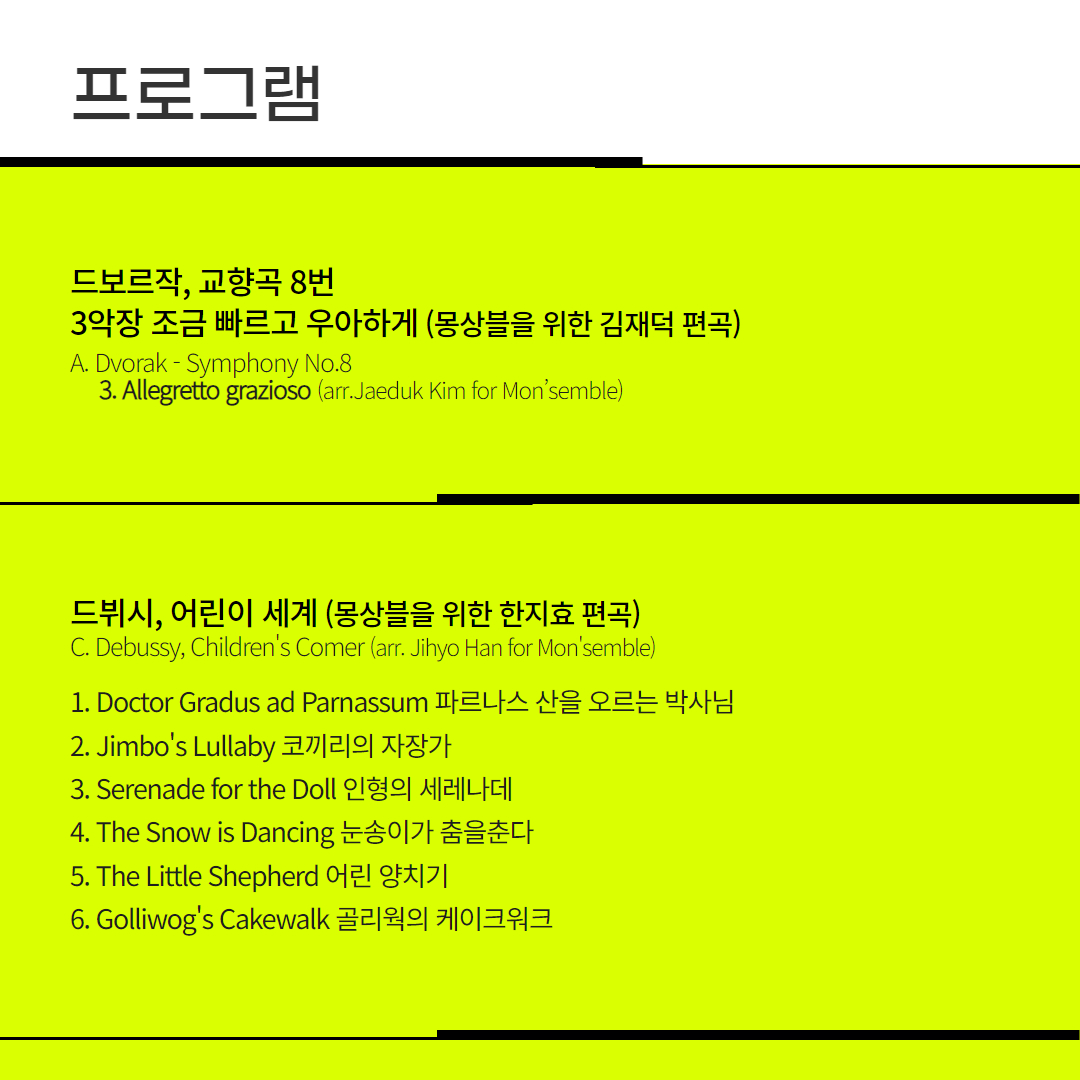 어린 시절, 과학의 날마다 그렸던 과학상상화처럼, 이제 음악을 통해 상상의 나래를 펼쳐보는 것은 어떨까요? 몽상블은 어린 시절의 순수한 상상을 떠올리며, 관객들이 다양한 이미지와 이야기를 떠올릴 수 있도록 특별한 곡들을 준비했습니다. 다양한 시대의 명곡들을 해설과 함께 들려드리며, 여러분을 상상의 나라로 초대합니다. 상상력의 폭발을 느낄 수 있는 이번 공연을 놓치지 마세요!💖