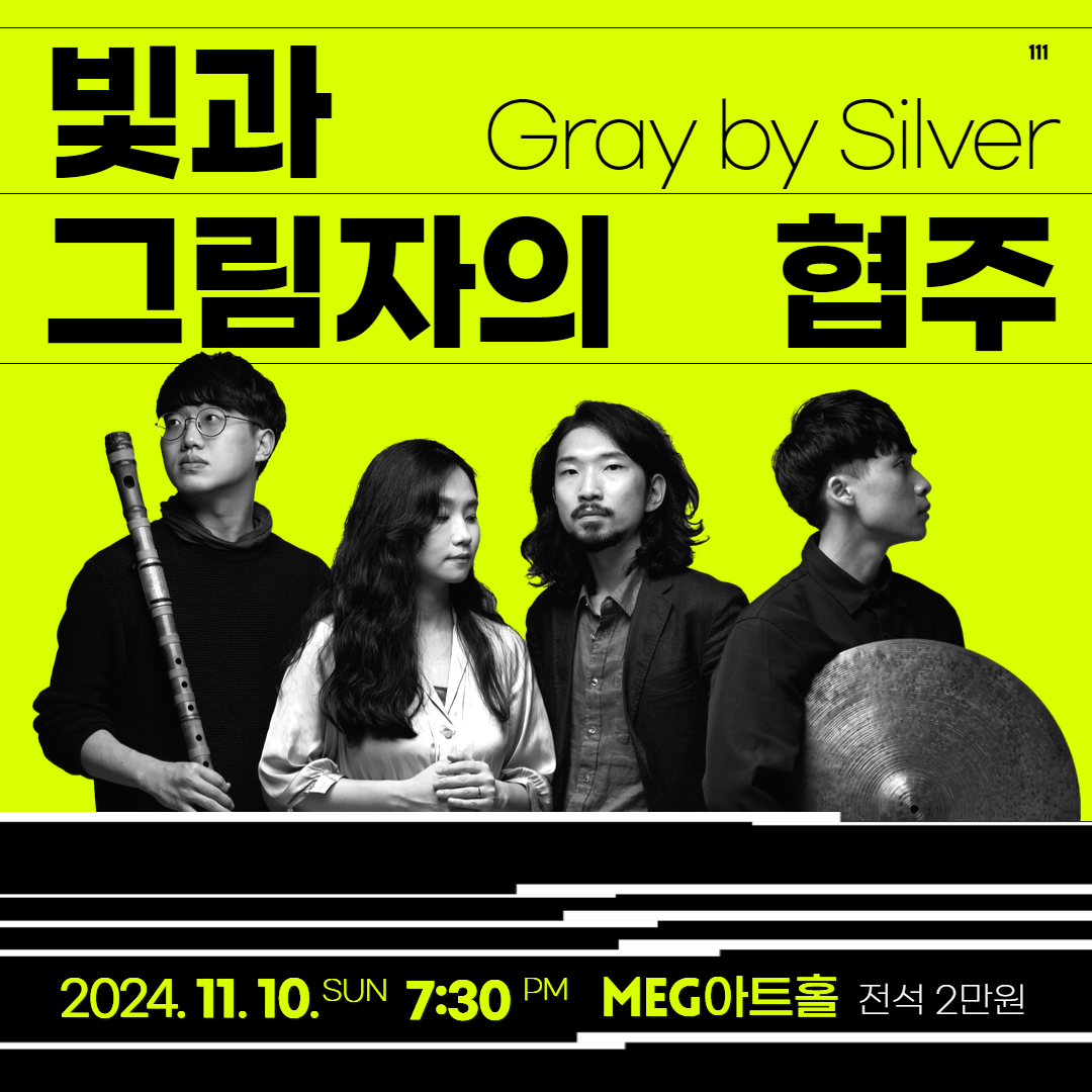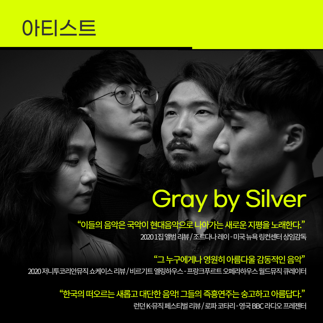 Gray by Silver는 피아노, 보이스, 대금, 드럼이 어우러진 팀으로, 전 세계 무대에서 창작 음악을 선보이며 한국 음악의 새로운 흐름을 이끌고 있습니다. 이들은 전통과 현대를 넘나들며 다양한 장르의 음악을 교차시키며, 깊이 있는 감성과 독창적인 연주로 주목받고 있습니다.