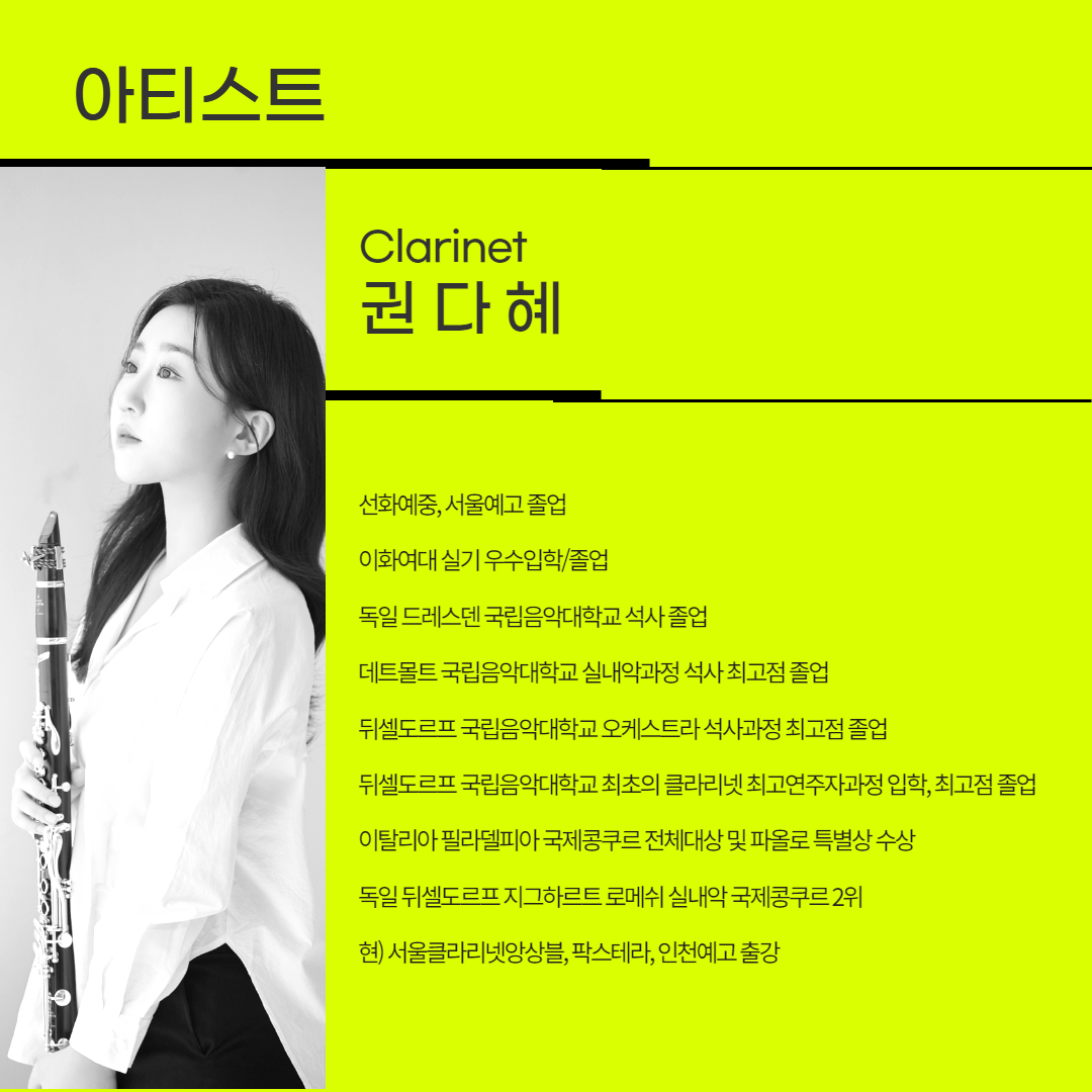 클라리넷 권다혜, 비올라 박다영, 피아노 이정욱이 함께하는 이번 연주에서는 모차르트, 브람스, 슈만의 아름다운 선율이 가을의 고요하고 따스한 감성과 완벽하게 어우러집니다.