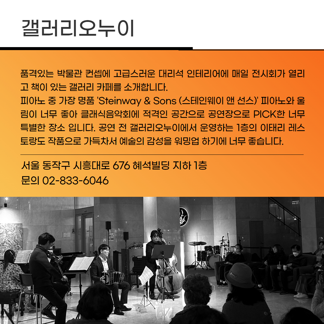 ‘흑백낭만’이라는 제목처럼 이번 공연은 음악의 다채로운 색채와 감정을 흑과 백의 명료함 속에 담아내며 우리에게 클래식 음악의 순수한 낭만을 전해줄 것입니다. 11월 14일, 갤러리오누이에서 펼쳐지는 이 특별한 무대에서 깊고도 풍부한 감성의 여정을 함께하세요.