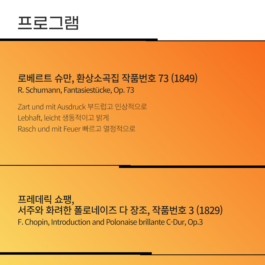쇼팽과 슈만이 남긴 깊은 감성과 섬세한 정서는 이번 듀오 리사이틀에서 더욱 빛을 발할 것입니다. 흑과 백이 조화를 이루는 피아노와 첼로의 소리는 그 자체로 대비와 균형을 담고 있으며, 두 악기가 서로에게 전하는 대화 속에서 묵직한 감동과 서정적인 아름다움이 녹아듭니다.