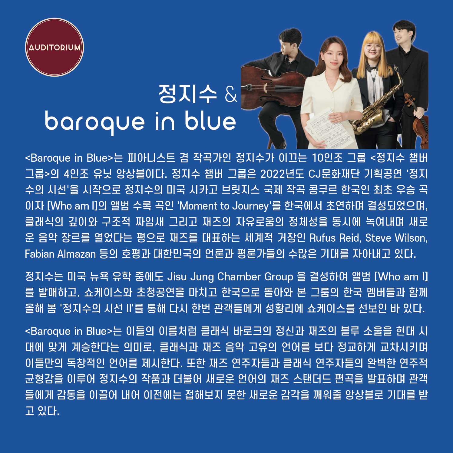 뉴욕과 한국을 넘나들며 감각적인 음악세계를 펼치고 세계적인 재즈 거장들의 찬사를 받고 있는 피아니스트 정지수의 창의적인 편곡과 해석이 가득 담긴 무대!
