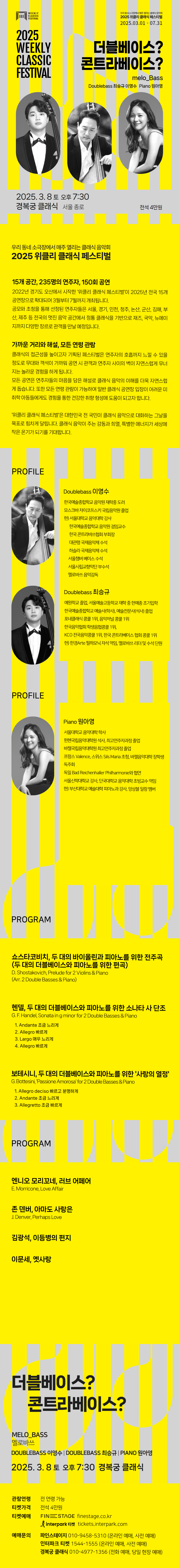 3/8(토) 7:30pm 경복궁클래식에서 예정된 '더블베이스? 콘트라베이스? - melo_Bass' 공연은 공연장 바로 앞에서 예정된 탄핵 집회로 인하여 연기되었습니다.