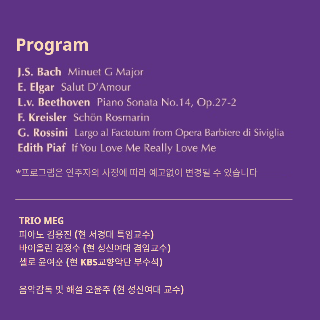 💜출연: Trio MEG (피아노 김용진, 바이올린 김정수, 첼로 윤여훈)